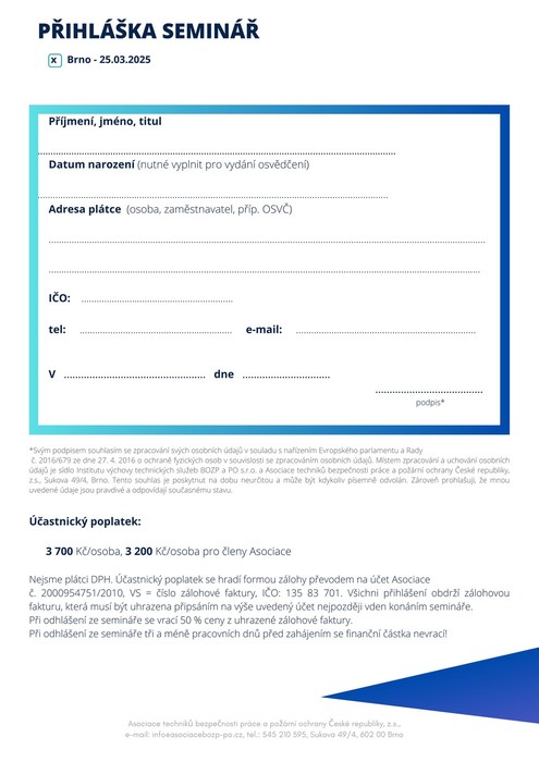 Účastnický poplatek: 3 700 Kč/osoba, 3 200 Kč/osoba pro členy Asociace
