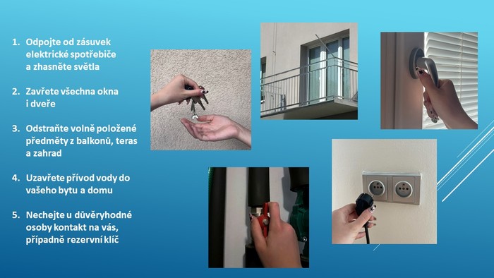 - Zavřete všechna okna i dveře. Prudký déšť může způsobit škody nejen ve vašem bytě, ale voda může protéct i k sousedům. Silný vítr může rozbít skla v oknech.